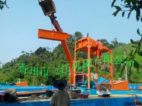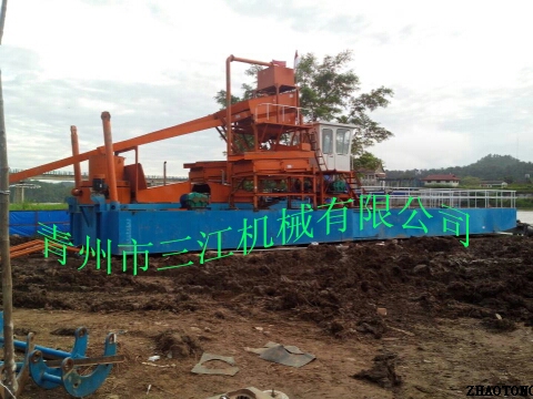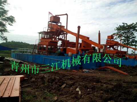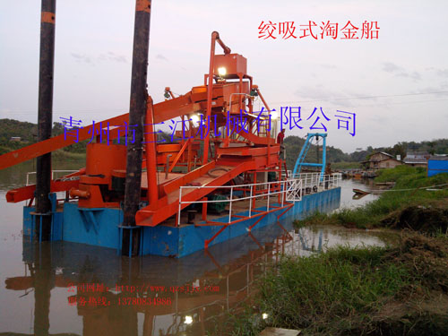 本設(shè)備的上料系統(tǒng)為6英寸抽沙泵,抽沙形式為絞刀頭和泵組成的絞吸式抽沙系統(tǒng),篩分系統(tǒng)為多層振動(dòng)篩。淘金系統(tǒng)為兩套鼓動(dòng)式淘金溜槽和固定式淘金氈溜槽組成的組合淘金槽。另外還配有一套60型淘金離心機(jī)。本設(shè)備挖掘深度為16米,由于是由絞刀頭組成的絞吸式抽沙方式,所以可以適應(yīng)復(fù)雜的工況條件,比如含有硬泥層的地形。